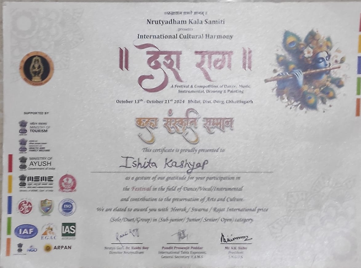कोरबा/भारत की संस्कृति और कला को संरक्षित रखने एवं विस्तार करने के उद्देश्य से छत्तीसगढ़ की इस्पात नगरी भिलाई में विगत दिनों नृत्य धाम कला समिति के तत्वाधान में इंटरनेशनल कल्चरल हार्मनी “देश राग ” का आयोजन किया गया था जिसमें देशभर के विभिन्न प्रांतो से आए कलाकारों ने अपनी कला का प्रदर्शन किया इस महोत्सव में कोरबा की होनहार कथक नृत्यांगना इशिता कश्यप के विशेष उपलब्धियो को देखते हुए उन्हें गेस्ट आर्टिस्ट के रूप में स्पेशल परफॉर्मेंस के लिए विशेष रूप से आमंत्रित किया गया था जहां देश-विदेश से आए अनेक विद्वानों एवं गुरुजनों के बीच इशिता को कला संस्कृति सम्मान से नवाजा गया जो पुरे छत्तीसगढ़ कला जगत के लिए बहुत ही गर्व का विषय है ,इशिता ने अपनी प्रस्तुति में शिव वंदना एवं झपताल में रायगढ़ घराने के बोल बंदिशों के अलावा 200 चक्कर की विशेष प्रस्तुति दी जिसे देखकर सभी मंत्रमुग्ध हो गए ,ज्ञात हो कि इशिता कश्यप गुरु मोरध्वज वैष्णव जी के कुशल मार्गदर्शन में नृत्य की शिक्षा प्राप्त करते हुए सांस्कृतिक स्तोत्र व प्रशिक्षण केंद्र संस्कृति मंत्रालय भारत सरकार द्वारा आयोजित नेशनल स्कॉलरशिप 2023 _24 (जूनियर वर्ग )में छत्तीसगढ़ की एकमात्र कथक नृत्यांगना के रूप में चुनी गई है जिसके कारण इशिता को इस सम्मान के लिए चुना गया, इशिता महज 11 वर्ष की छोटी सी उम्र में ही देश विदेश के अनेकों प्रतिष्ठित मंचों पर अपनी कुशल प्रस्तुति दे चुकी है , तथा छत्तीसगढ़ में कथक नृत्य के क्षेत्र में अपनी अलग पहचान बना चुकी है ,इशिता को हाल ही में अखिल भारतीय संस्कृतिक संघ पुणे में आयोजित “भाव राग ताल “में भी प्रथम स्थान हासिल करने पर “आबू धाबी “दुबई के लिए आमंत्रित किया गया है जो आने वाले 7 से 10 नवंबर को आयोजित होगा , इशिता आगे चलकर शास्त्रीय नृत्य कथक में ही अपनी विशेष पहचान बनाना चाहती है एवं अपनी भारतीय संस्कृति कथक की उपयोगिता को देश विदेशों तक अवगत कराना चाहती है ,माता अनिता कश्यप एवं पिता रघुनंदन कश्यप की होनहार पुत्री इशिता के इस उपलब्धि के लिए सभी ने इशिता को अपनी शुभकामनाएं दिए हैं।