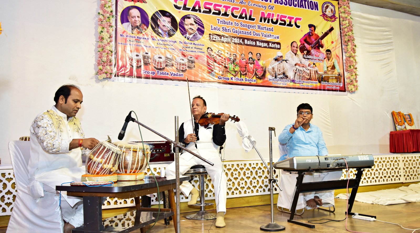कोरबा। दिनांक 12 अप्रैल को छत्तीसगढ़ राइजिंग आर्टिस्ट एसोसिएशन के तत्वाधान में साईं मंगलम बालकोनगर कोरबा में शास्त्रीय संगीत संध्या का आयोजन किया गया। कार्यक्रम के मुख्य अतिथि प्रतिष्ठित उद्योगपति एवं वायलिन वादक श्री अशोक अग्रवाल एवं कार्यक्रम की अध्यक्षता छत्तीसगढ़ राइजिंग आर्टिस्ट एसोसिएशन के प्रमुख संरक्षक श्री शशि सिंह जी ने किया। वहीं विशिष्ट अतिथि के रूप में संगीत मार्तण्ड स्व. श्री गजानंद दास वैष्णव जी की धर्म पत्नी श्रीमती यज्ञसेनी वैष्णव, छत्तीसगढ़ राइजिंग आर्टिस्ट एसोसिएशन के प्रांताध्यक्ष डॉ गिरीश केशकर, अंतरराष्ट्रीय ख्याति प्राप्त तबला वादक एवं एसोसिएशन के प्रमुख मार्गदर्शक पंडित मोरध्वज वैष्णव एवं अंतरराष्ट्रीय ख्यातिलब्ध कवयित्री डॉ. आशा आज़ाद जी थे। कार्यक्रम का शुभारंभ अतिथियों द्वारा माँ सरस्वती एवं स्व. श्री गजानंद दास वैष्णव जी की तैल्य चित्र पर दीप प्रज्वलित कर एवं प्रसिद्ध शास्त्री गायक श्री कन्हैया दास वैष्णव एवं उनके शिष्यों द्वारा सरस्वती वंदना से किया गया। कार्यक्रम में पंडित मोरध्वज वैष्णव के नन्हे नन्हे शिष्यों द्वारा सामूहिक तबला वादन एवं सामूहिक कथक नृत्य की प्रस्तुति ने दर्शकों को मंत्रमुग्ध किया वहीं शास्त्रीय गायक कन्हैया दास वैष्णव जी ने शानदार प्रस्तुति दी। कार्यक्रम की मुख्य अतिथि श्री अशोक अग्रवाल जी के द्वारा एक प्यार का नगमा है की धुन को वायलिन में प्रस्तुति देकर महफिल सजाया वहीं कार्यक्रम के प्रमुख आकर्षण कोलकाता से आये अंतरराष्ट्रीय ख्यातिलब्ध सितार वादक पंडित असीम चौधरी के सितार वादन ने दर्शकों को देर रात तक भाव विभोर किया।