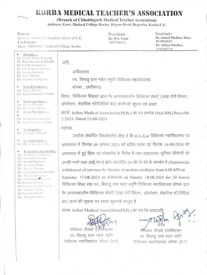 इसके विरोध में कोरबा जिला मेडिकल कॉलेज के डॉक्टर सुबह से ही विरोध कर हड़ताल पर रहेंगे ओपीडी सुविधा बंद रहेगी वहीं आपातकालीन के लिए दो उपलब्ध रहेंगे।