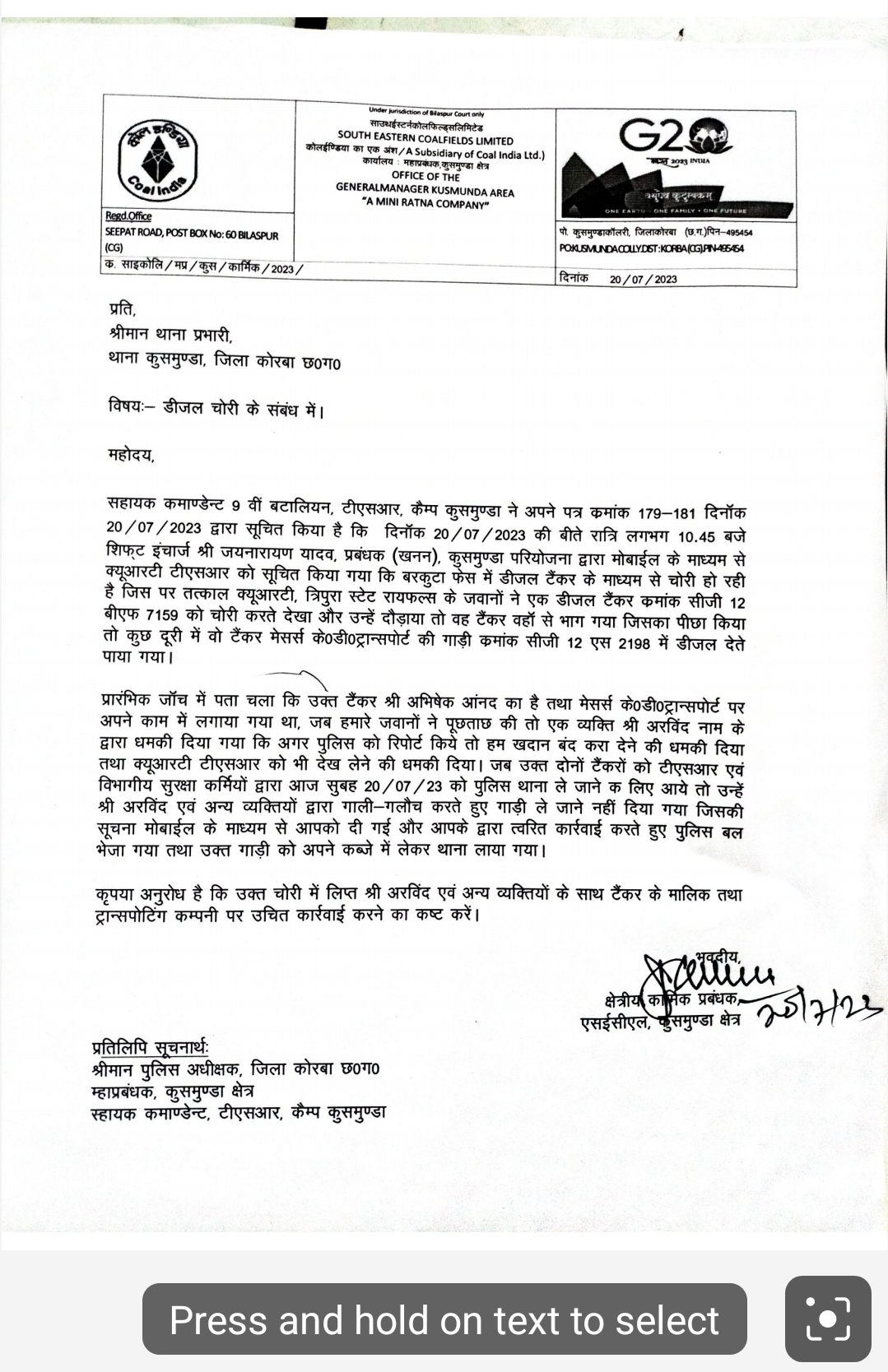 कोरबा/घटना एसईसीएल कुसमुंडा क्षेत्र का है जहां बीती रात दिनांक 19.07.2023 के लगभग रात्रि 10:45 बजे त्रिपुरा स्टेट राइफल्स के जवानों को प्राप्त रिपोर्ट के आधार पर खदान परिसर में क्यूआरटी के माध्यम से डीजल चोरी को पकड़ने दबिश दी गई, कुसमुंडा परियोजना अंतर्गत बरकुटा फेस में टैंकर वाहन क्रमांक सीजी 12 बीएफ 7159 को डीजल चोरी करते देखा गया पीछा करने पर टैंकर चालक मौके से टैंकर सहित भाग निकला आगे पीछा करने पर उक्त टैंकर द्वारा मेसर्स केडी ट्रांसपोर्ट की गाड़ी क्रमांक सीजी 12 एस 2198 में अविनाश नाम के व्यक्ति द्वारा डीजल डालते पकड़ा गया। जांच से पता चला कि टैंकर मालिक अभिषेक आनंद है तथा पूछताछ करने पर अरविंद जो केडी ट्रांसपोर्ट में बतौर मुंशी है, के द्वारा थाने पर रिपोर्ट करने के विरोध में त्रिपुरा स्टेट राइफल्स एवं एसईसीएल से विभागीय सुरक्षा जवानों को गाली गलौज करते हुए खदान बंद करने की धमकी दिया गया I बाद में थाना प्रभारी थाना कुसमुंडा को प्राप्त रिपोर्ट पर टैंकर वाहन को जप्त कर लिया गया है, एसईसीएल प्रबंधन द्वारा पत्राचार कर थाना प्रभारी को टैंकर मालिक एवं ट्रांसपोटिंग कम्पनी के विरुद्ध प्राथमिकी दर्ज करने संबंधी अनुरोध किया गया है।