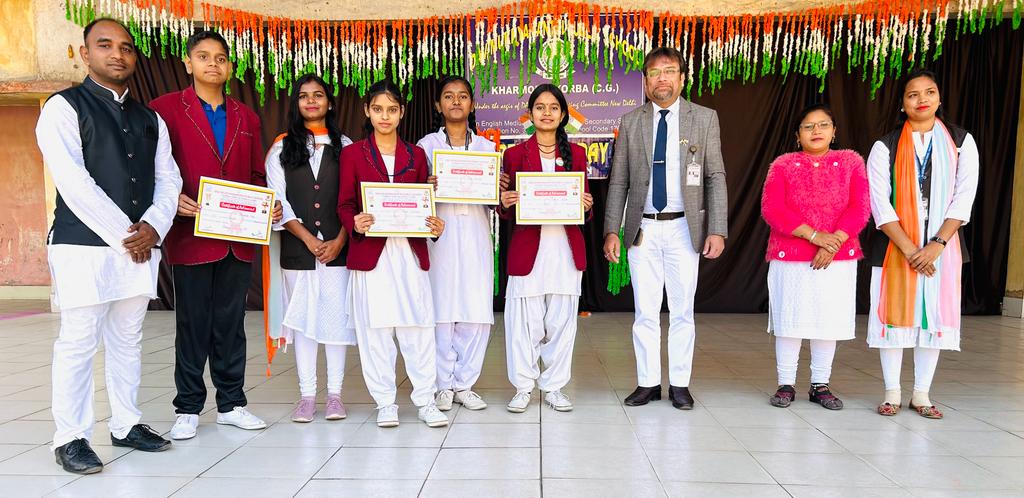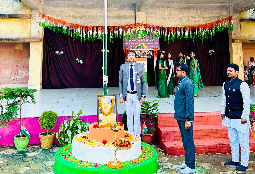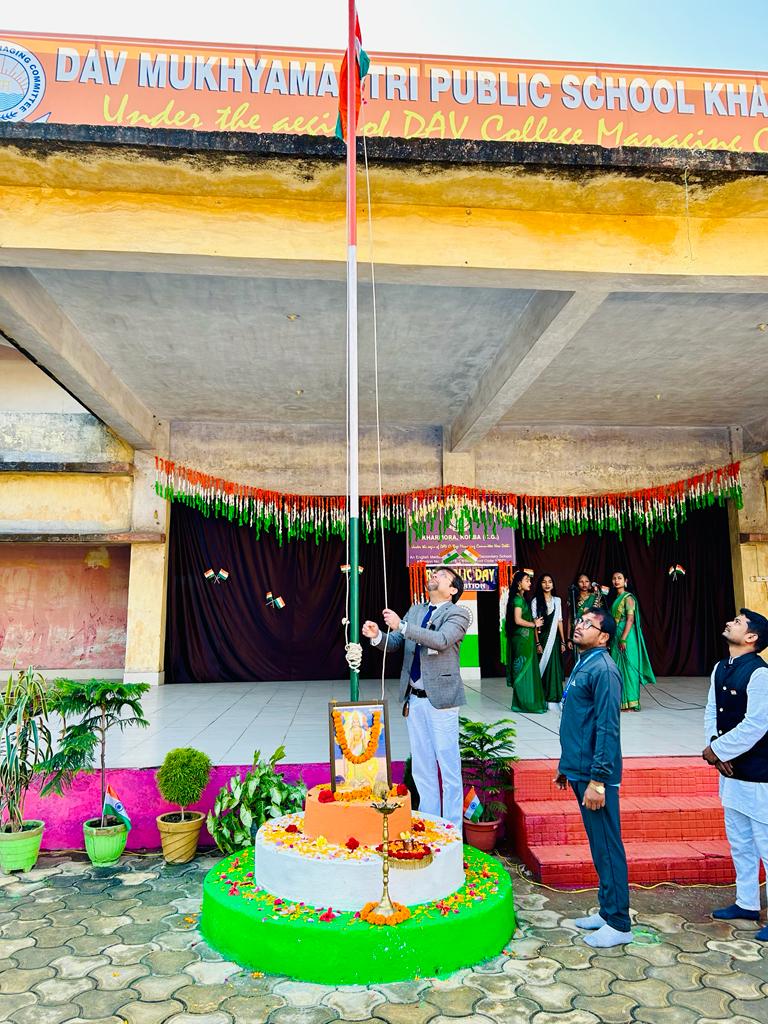 डी. ए .वी मुख्यमंत्री पब्लिक स्कूल खरमोरा कोरबा में 75 वा गणतंत्र दिवस बड़े ही हर्षोल्लास व धूमधाम से मनाया गया ।इस अवसर पर विद्यालय के विद्यार्थियों द्वारा अनेक सांस्कृतिक कार्यक्रम प्रस्तुत किये गए , यह कार्यक्रम विद्यालय के प्राचार्य श्री हेमंतो मुखर्जी के अध्यक्षता व दिशा निर्देशन में कराया गया। इस गणतंत्र दिवस के कार्यक्रम में सर्वप्रथम विद्यालय प्रांगण में प्राचार्य महोदय द्वारा ध्वजारोहण कर राष्ट्र गान व डी.ए.वी गान गाया गया जिसमे विद्यालय के समस्त शिक्षक व शिक्षिकाएं , अन्य कर्मचारी मौजूद रहे। तत्पश्चात भारत माता के छाया चित्र पर माल्यार्पण व श्रद्धा सुमन अर्पित कर स्वतंत्रता संग्राम के महान बलिदानियों को याद किया गया। इस कार्यक्रम में विद्यालय प्रांगण में छात्र एवं छात्राओं द्वारा परेड व झंडे की सलामी दी गई ।