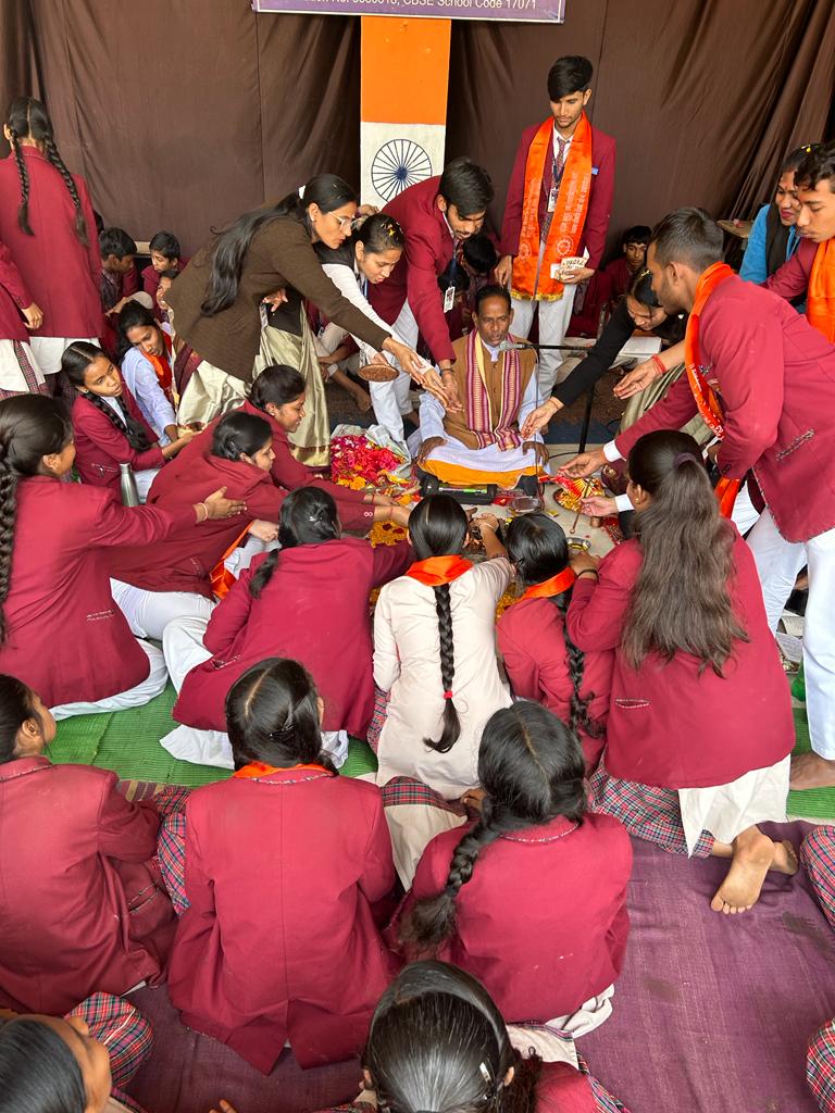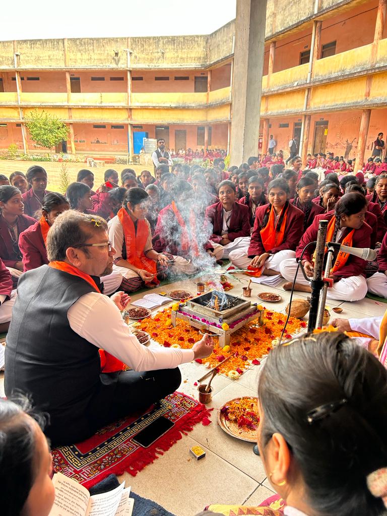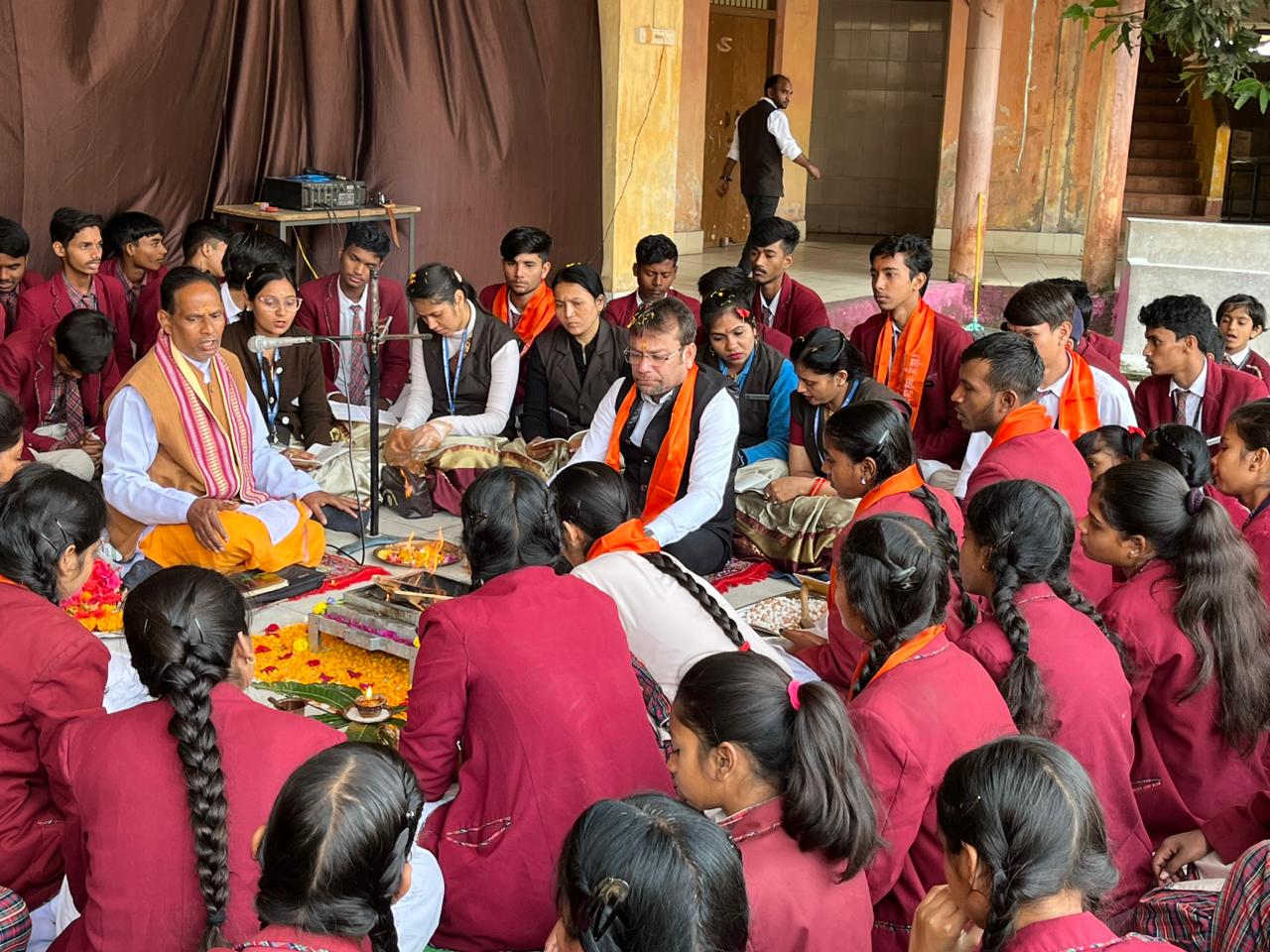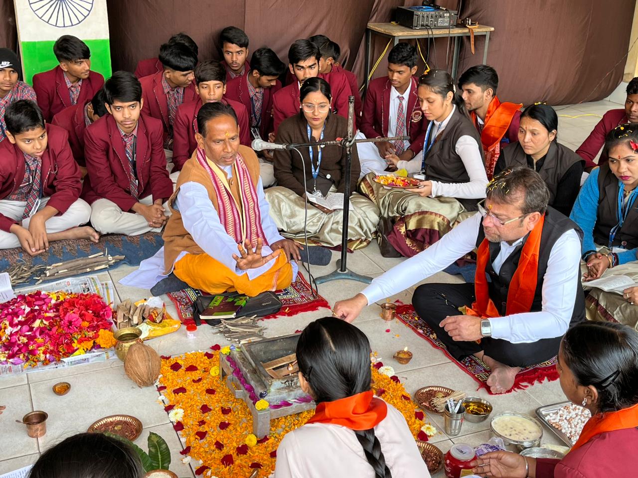 डी. ए. व्ही मुख्यमंत्री पब्लिक स्कूल खरमोरा में विद्यालय के प्राचार्य श्री हेमंतो मुखर्जी के अध्यक्षता व मार्गदर्शन में विद्यालय प्रांगण में कक्षा दसवीं व बारहवीं तथा अन्य सभी विद्यार्थियों की वार्षिक परीक्षाओं में सफल होने व उत्कृष्ट परीक्षा परिणामों हेतु वैदिक हवन किया गया। इस हवन विधि में विद्यालय के समस्त शिक्षकगण , विद्याथियों एवं अन्य स्टाफ की उपस्थिति रही। इस हवन कार्यक्रम का मुख्य उद्देश्य आर्य सिद्धान्तों की स्थापना करना तथा समस्त विद्याथियों के उत्कृष्ट परीक्षा परिणामों के आने व विद्यार्थियों के उज्जवल भविष्य के लिए ईश्वर से प्रार्थना करना था। इस हेतु विद्यालय में विशेष हवन व वैदिक मंत्रोच्चारण श्री उद्धव प्रसाद शास्त्री जी द्वारा किया गया। इस हवन कार्यक्रम में उपस्थित समस्त जनों ने हवन कुंड में पूर्णाहुति डालकर विद्यार्थियों की परीक्षाओं में सफलता पाने व विश्व कल्याण की मंगल कामना की गई। इस अवसर पर विद्यार्थियों द्वारा भजन गायन सहित प्रार्थना गीत भी गाया गया व हवन के दौरान विद्यालय का पूरा प्रांगण ओम नाद के उच्चारण से गुंजायमान हो रहा था। इस वैदिक हवन में उपस्थित सभी शिक्षक – शिक्षिकाओं ने विद्यार्थियों को आशीर्वाद प्रदान किया व पुष्पवर्षा की तथा उनके जीवन में उनके लक्ष्य की सफलता पूर्वक प्राप्ति हेतु मंगलकामना की गई। कार्यक्रम के अंत मे विद्यालय के प्राचार्य श्री हेमंतो मुखर्जी ने विद्यार्थियों की बोर्ड परीक्षा में सफलता प्राप्त करने व विद्यार्थियों को परिश्रम करने की प्रेरणा देते हुए उनके उज्जवल भविष्य की कामना की व कहा कि विद्यालय में पढ़ाई के साथ वेद व संस्कृति का भी ज्ञान विद्यार्थी प्राप्त करते है व ईश्वर के आशीर्वाद के साथ-साथ हमे अच्छे कर्म करने से ही सफलता प्राप्त हो सकती है। अंत में सभी को प्रसाद वितरण कर कार्यक्रम का समापन किया गया व प्राचार्य श्री हेमंतो मुखर्जी द्वारा कक्षा बारहवीं के समस्त विद्यार्थियों को विद्यालय परिवार की ओर से स्मृति चिन्ह प्रदान किए गए तथा अभिभावकों की उपस्थिति में सभी विद्यार्थियों को प्राचार्य द्वारा बोर्ड परीक्षा के प्रवेश पत्र का वितरण किया गया तथा केंद्रीय माध्यमिक शिक्षा मंडल दिल्ली द्वारा जारी किए गए बोर्ड परीक्षाओं से संबंधित क्रम वार दिशा- निर्देशन भी प्राचार्य द्वारा विद्यार्थियों को अभिभावकों की उपस्थिति में दी गई।