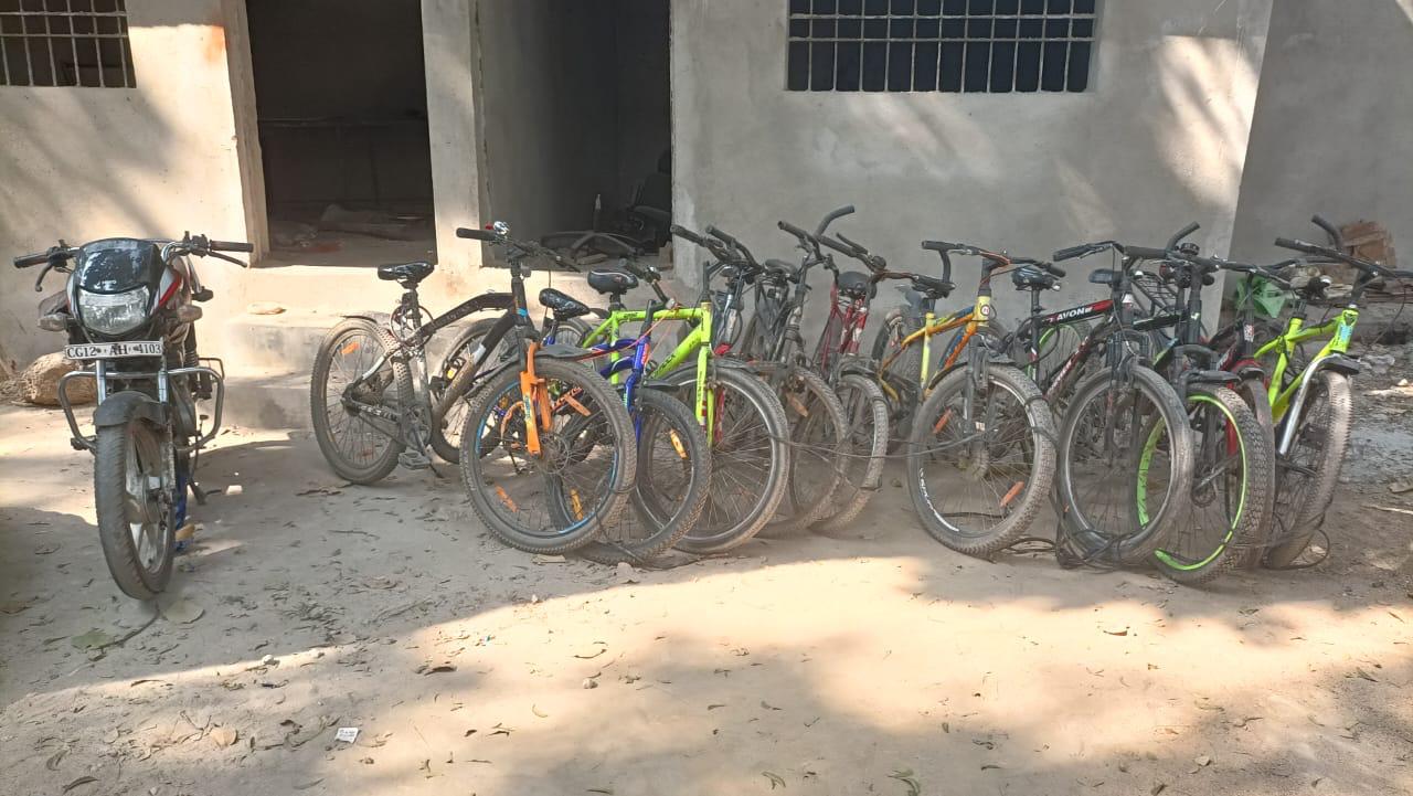 कोरबा.श्रीमान पुलिस अधीक्षक महोदय कोरबा श्री जितेन्द्र शुक्ला के दिशा निर्देश पर अतिरिक्त पुलिस अधीक्षक महोदय श्री अभिषेक वर्मा, नगर पुलिस अधीक्षक महोदय श्री भूषण एक्का एवं थाना प्रभारी कोतवाली श्री रूपक शर्मा, के मार्गदर्शन में चौकी प्रभारी मानिकपुर प्रेमचंद साहू के नेतृत्व में मानिकपुर पुलिस द्वारा दिनांक 01/12/2023 को चोरी किये गए 11 नग स्पोर्ट्स साइकिल और एक नग मोटर साइकिल को जप्त करने में सफलता प्राप्त हुई है. दिनांक 01/12/2023 को सुचना प्राप्त हुआ था कि भदरापारा बालको निवासी भूपेश साहू उर्फ़ राहुल साहू चोरी के साइकिल और मोटर साइकिल को बेचने के लिए मानिकपुर क्षेत्र में ग्राहक तलाश रहा है, उक्त सूचना पर आरोपी भूपेश साहू को रेलवे कॉलोनी में घेराबंदी कर पकड़ा गया और उसके बताये जगहों से 11 नग स्पोर्ट्स साइकिल और एक मोटरसाइकिल HF डीलक्स क्र CG 12 AH 4103 को बरामद कर 41(1)(4)/379 द प्र स के तहत कार्यवाही किया गया है!