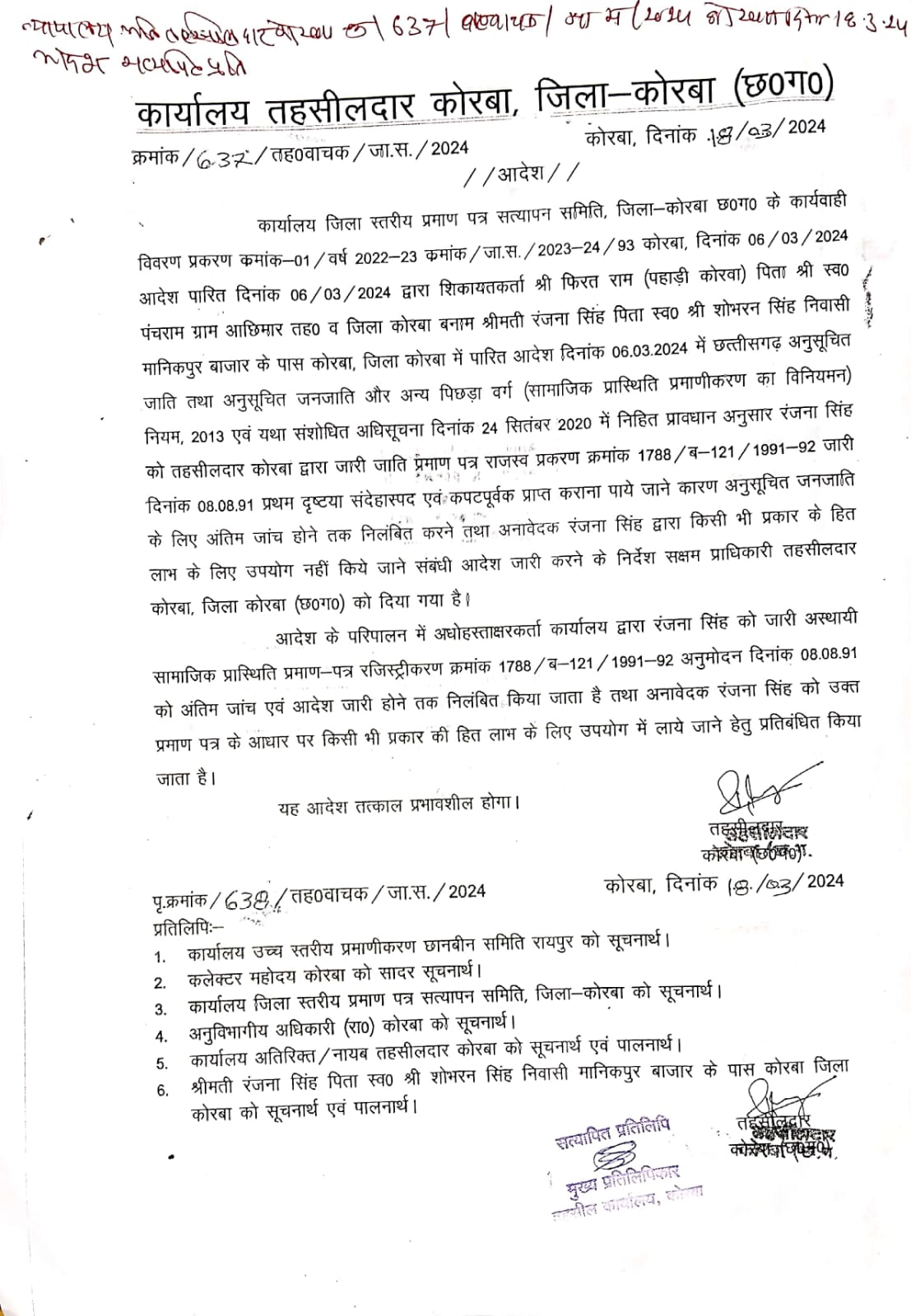 कोरबा,/ पिछले दिनों प्रशासन ने सत्य व न्याय का साथ देते हुए निष्पक्ष जांच की जिसका नतीजा यह हुआ कि सत्य की जीत हुई है और आदिवासी बन लोगो को प्रताड़ित कर रही रंजना सिंह के फर्जी जाति प्रमाणपत्र को निलंबित किया गया है। पुलिस ने उसके ऊपर अपराध भी दर्ज कर लिया है। 20 मार्च को प्रशासन की संयुक्त टीम ने जमीन का सीमांकन किया और बताया है की जिस जमीन और मकान पर रंजना सिंह ने कब्जा कर रखा है वो जमीन और मकान मेरी है। लेकिन अब तक कब्जा खाली नहीं कराया गया है। जिससे मेरा परिवार अब तक व्यथित है।