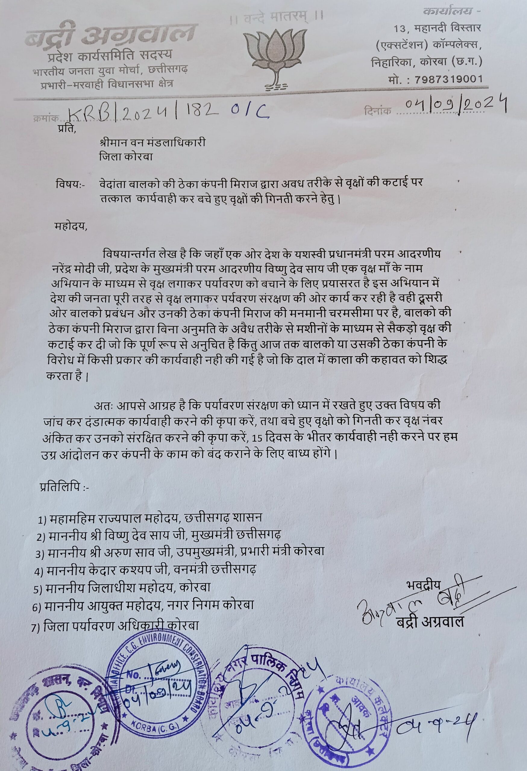 कोरबा:- बालको वेदांता की ठेका कंपनी मिराज द्वारा पेड़ो की अंधाधुंध कटाई की जा रही है जिसमे रोक लगाने की भाजपा नेता बद्री अग्रवाल ने मांग की है, भाजपा नेता ने जिला वन मंडलाधिकारी कोरबा को ज्ञापन सौंपा है |
