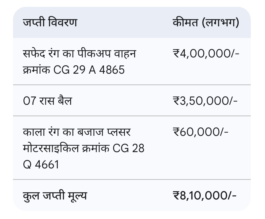 दिनांक 29/10/2025 को मुखबिर से प्राप्त सूचना के आधार पर थाना उरगा पुलिस टीम द्वारा ग्राम सराईपाली पंचायत रिवापार में घेराबंदी कर दबिश दी गई। इस दौरान, एक सफेद रंग का पीकअप वाहन क्रमांक CG 29 A 4865 को रोका गया, जिसमें 07 रास बैल अवैध रूप से परिवहन किए जा रहे थे।