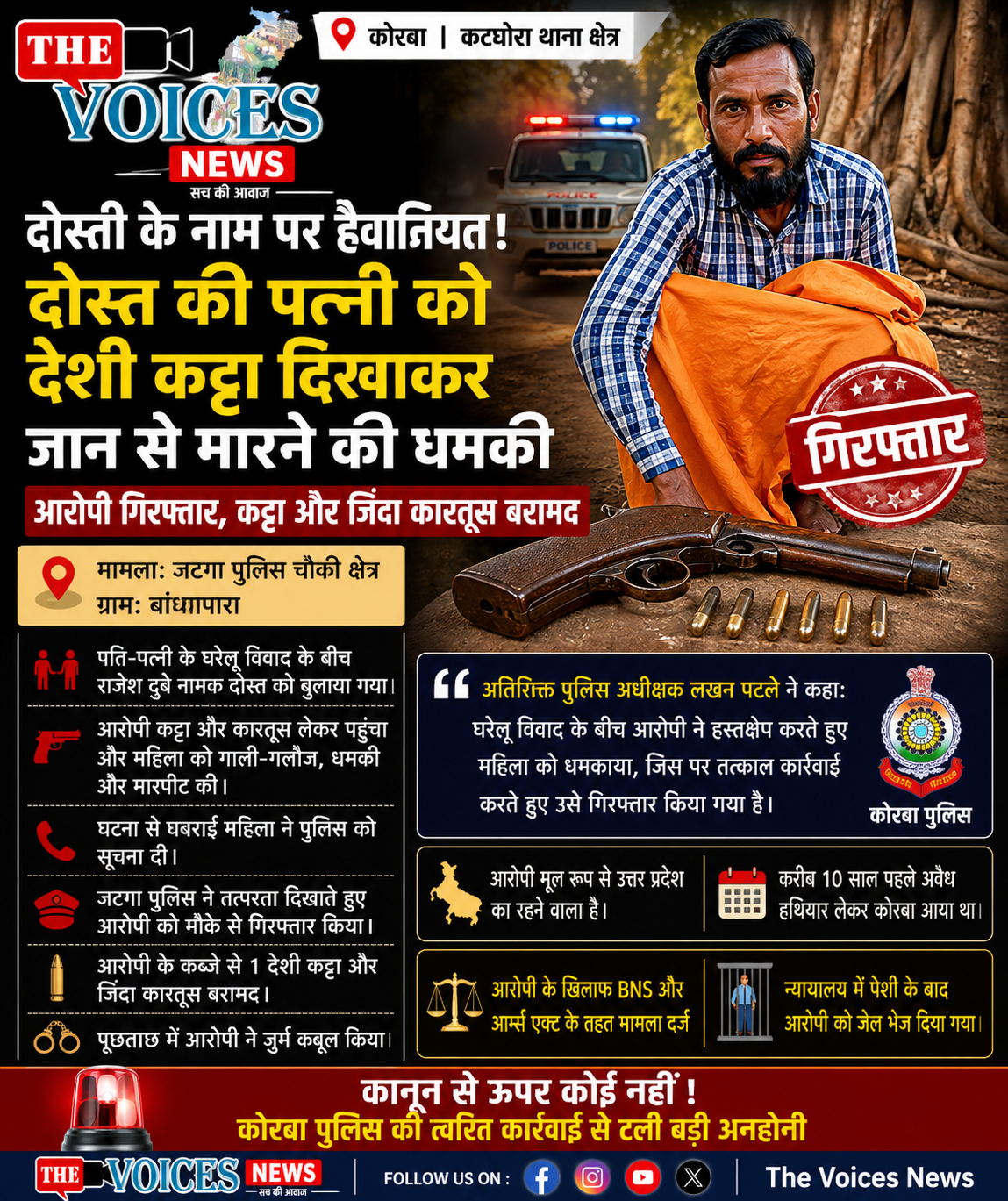 कोरबा के कटघोरा थाना क्षेत्र में एक सनसनीखेज मामला सामने आया है, जहां दोस्ती निभाने के नाम पर एक व्यक्ति ने कानून हाथ में ले लिया और अपने ही दोस्त की पत्नी को देशी कट्टा दिखाकर जान से मारने की धमकी दे डाली। पुलिस ने त्वरित कार्रवाई करते हुए आरोपी को गिरफ्तार कर लिया है और उसके कब्जे से देशी कट्टा व जिंदा कारतूस बरामद किया गया है।