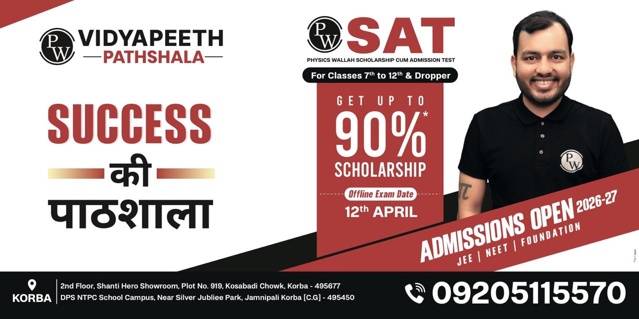 *कोरबा।* शहर के विद्यार्थियों के लिए एक बड़ा शैक्षणिक अवसर सामने आया है। *Physics Wallah Vidyapeeth Pathshala, Korba* द्वारा आगामी *12 अप्रैल* को *Mega Offline Scholarship Test (SAT)* आयोजित किया जा रहा है, जिसके माध्यम से छात्रों को *90% तक स्कॉलरशिप* प्राप्त करने का सुनहरा मौका मिलेगा। यह परीक्षा विशेष रूप से कक्षा 8वीं से 12वीं तक के विद्यार्थियों तथा JEE/NEET की तैयारी कर रहे छात्रों के लिए रखी गई है, ताकि उन्हें कम शुल्क में बेहतर गुणवत्ता वाली ऑफलाइन कोचिंग उपलब्ध कराई जा सके।