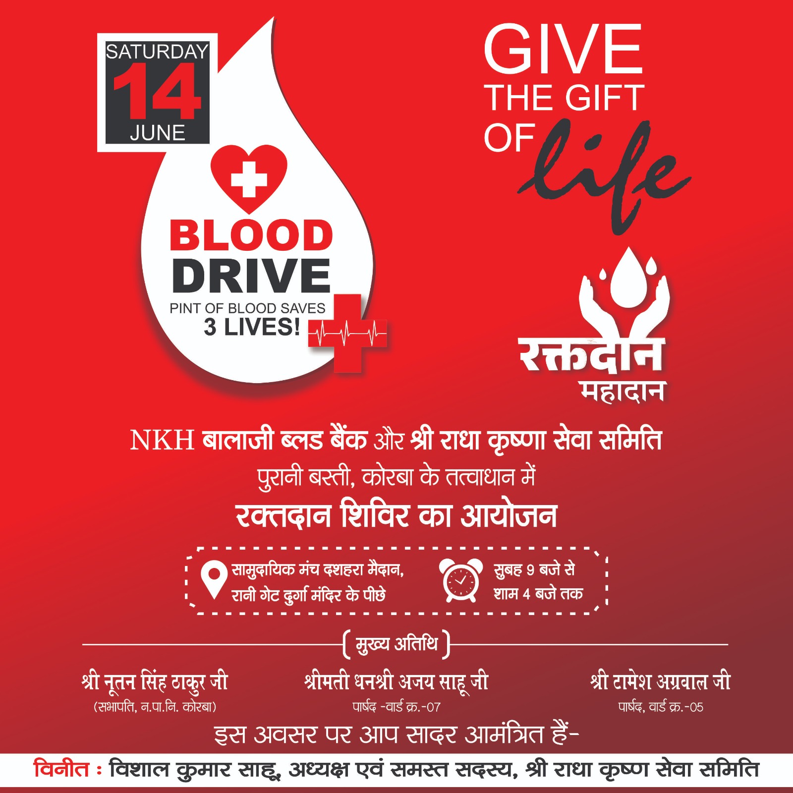 कोरबा। एन.के.एच. बालाजी ब्लड बैंक और श्री राधा कृष्ण सेवा समिति पुरानी बस्ती कोरबा के संयुक्त तत्वावधान में रक्तदान शिविर का आयोजन 14 जून शनिवार को सामुदायिक मंच दशहरा मैदान रानी गेट दुर्गा मंदिर के पीछे आयोजित किया जाएगा। उक्त शिविर में सुबह 9:00 से शाम 4:00 बजे के बीच पहुंचकर युवा व रक्तदाता अपना रक्तदान कर सकेंगे। इस अवसर पर मुख्य अतिथि नगर पालिका निगम कोरबा के सभापति नूतन सिंह ठाकुर, वार्ड क्र 07 की पार्षद धनश्री अजय साहू, वार्ड क्र. 06 के पार्षद टामेश अग्रवाल सहित समिति सदस्य के अलावा गणमान्य नागरिक उपस्थित रहेंगे। समिति के अध्यक्ष विशाल कुमार साहू ने लोगों को रक्तदान कर जरूरतमंदों की मदद करने की अपील की है।