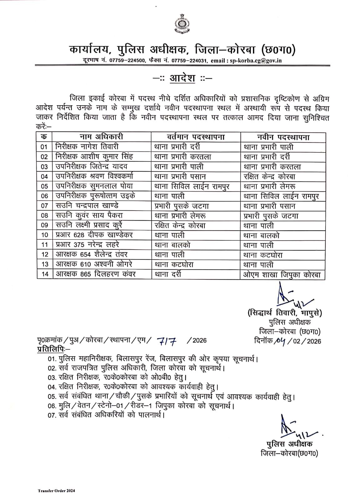 कोरबा। जिला पुलिस अधीक्षक सिद्धार्थ तिवारी ने प्रशासनिक दृष्टिकोण से जिले के पुलिस अधिकारियों और कर्मचारियों के तबादले का बड़ा आदेश जारी किया है। इस फेरबदल में निरीक्षक (Inspector), उपनिरीक्षक (SI) और सहायक उपनिरीक्षकों सहित कुल 14 पुलिसकर्मियों को नई पदस्थापना दी गई है।