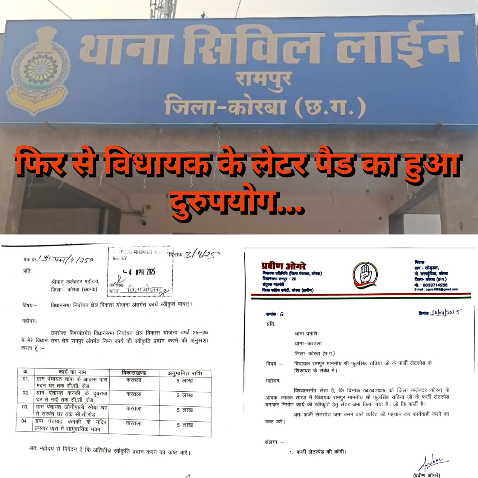 *विधायक के लेटर पैड का दुरुपयोग, डीएमएफ से 20 लाख के कार्यों की मंजूरी, विधायक ने कार्रवाई के लिए पुलिस को लिखा खत*