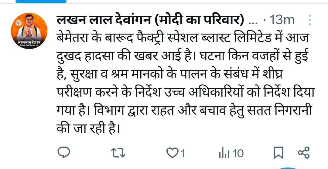 बेमेतरा हादसे में उद्योग और श्रम मंत्री श्री लखन लाल देवांगन ने जताया दुःख, अधिकारियो से मांगी शीघ्र विस्तृत रिपोर्ट