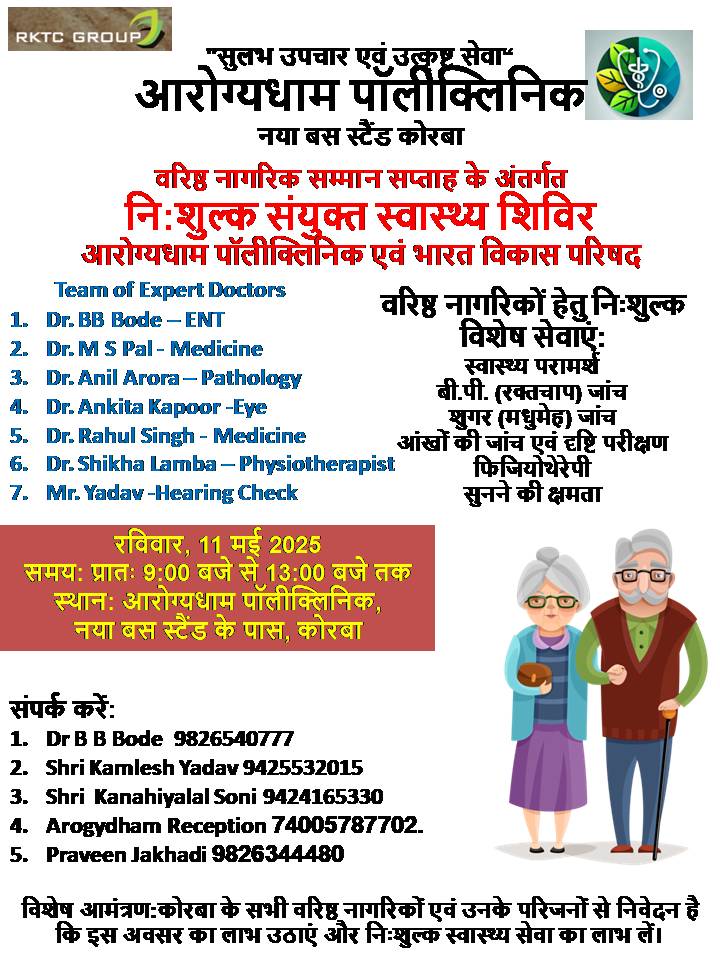 *वरिष्ठ नागरिकों हेतु निशुल्क स्वास्थ्य शिविर का आयोजन,आरोग्यधाम और भारत विकास परिषद का सराहनीय प्रयास*