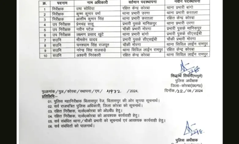 KORBA:बदले गए थाना-चौकियों के प्रभारी,कई कर्मी प्रभावित..