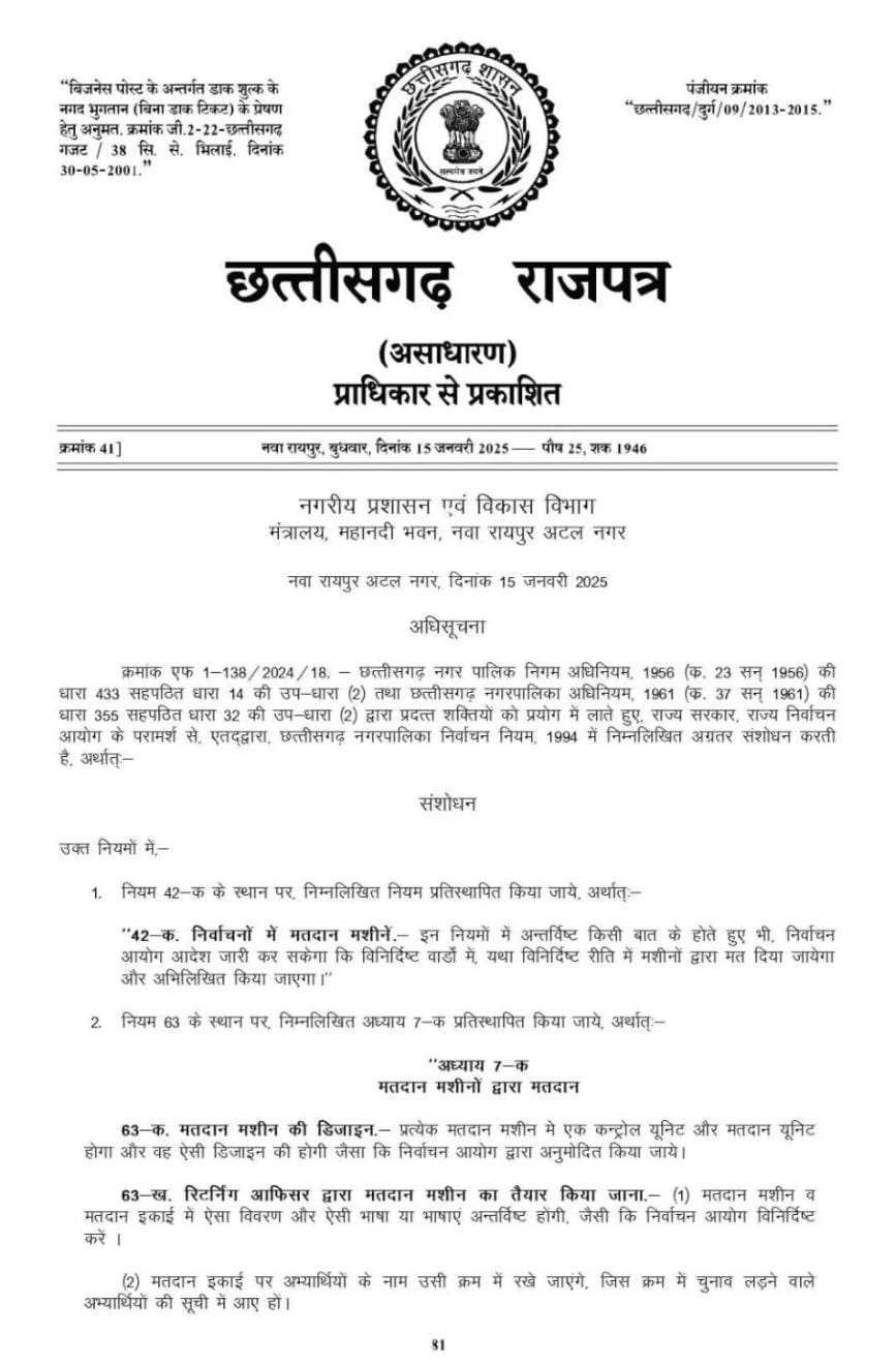 इसी बीच छत्तीसगढ़ सरकार ने नगरीय निकाय के चुनाव मतपत्र के बजाये इलेक्ट्रॉनिक वोटिंग मशीनब से कराये जाने संबंधी अधिसूचना भी जारी कर दी है।