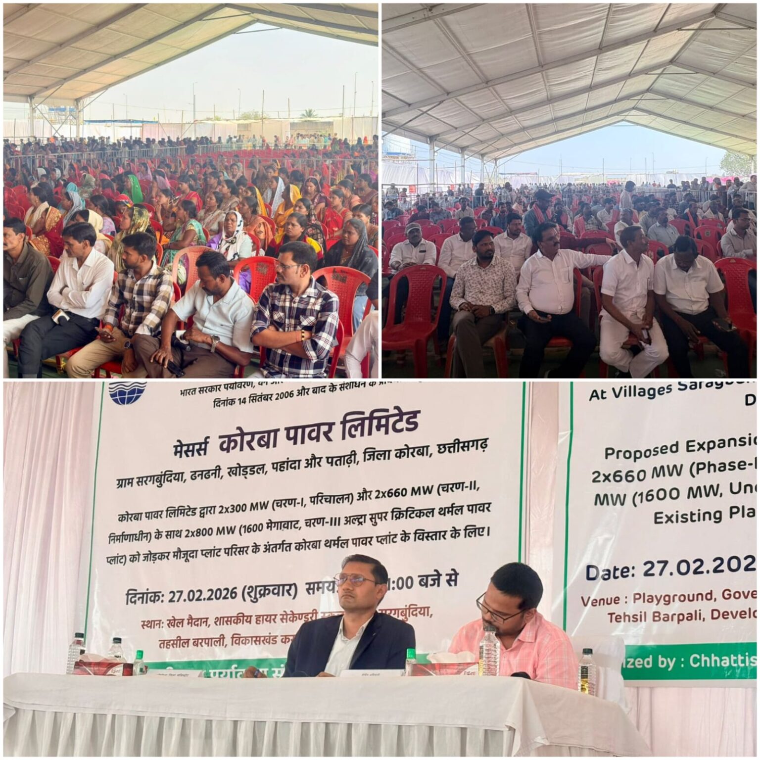 कोरबा; 27 फरवरी 2026: पर्यावरण संरक्षण मण्डल द्वारा जिले के बरपाली तहसील अंतर्गत कोरबा पॉवर लिमिटेड (केपील),पताड़ी के प्रस्तावित 1600 मेगावाट के क्षमता विस्तार के लिए शुक्रवार को आयोजित जनसुनवाई सफलता पूर्वक सम्पन्न हो गई। कलेक्टर कोरबा द्वारा छत्तीसगढ़ पर्यावरण संरक्षण मण्डल के पर्यावरण स्वीकृति के आदेश के लिए जनसुनवाई 27 फरवरी 2026 को दोपहर 12 बजे से ग्राम सरगबूंदिया स्थित शासकीय स्कूल के खेल मैदान में आयोजित की गई। जिसमें पीठासीन अधिकारी के रूप में कोरबा के अतिरिक्त कलेक्टर देवेन्द्र पटेल, छत्तीसगढ़ पर्यावरण संरक्षण मण्डल, कोरबा के क्षेत्रीय अधिकारी श्री अंकुर साहू मौजूद थे। इसके साथ ही एसडीएम सरोज कुमार महिलांगे, कार्यपालक अभियंता श्री प्रसन्ना सोनकर सहित अन्य प्रशासनिक अधिकारी उपस्थित थे। अदाणी पॉवर लिमिटेड से पर्यावरण विभाग प्रमुख आर एन शुक्ला ने केपील परियोजना के बारे में विस्तार से जानकारी दी। जनसुनवाई लगभग 2.30 घंटे तक चली। जिसमें बरपाली तहसील के ग्राम खोड्डल, पताड़ी, सरगबूंदिया,पहंदा, बरीडीह, तिलकेजा इत्यादि सहित कुल 12 गांव के हजारों ग्रामीणों ने भाग लिया। इस दौरान सभा में ग्रामीणों द्वारा मुख्यरूप से क्षेत्र के विकास, नौकरी और स्वरोजगार के लिए उचित प्रबंध सहित कई बातों तथा सुझावों को पीठासीन अधिकारी ने बड़े ही ध्यानपूर्वक सुनकर कंपनी के अधिकारियों की उपस्थिति में संबंधित मांगों पर विचार करने का भरोसा दिलाया।