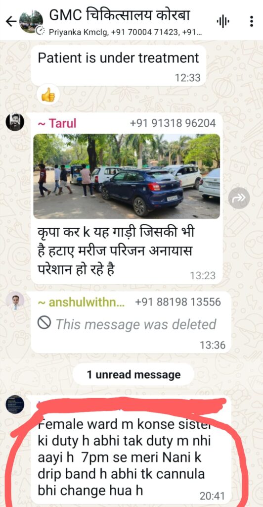 कोरबा मेडिकल कॉलेज में लापरवाही की हद ! बुजुर्ग महिला मरीज हाथ में खाली ड्रीप लेकर डेढ़ घंटे तड़पती रही, जिम्मेदार स्टॉफ नर्स ड्यूटी छोड़ चली गई घूमने — शिकायत करने पर प्रबंधन ने उल्टा डांटा, व्हाट्सएप में स्कैंडल वायरल