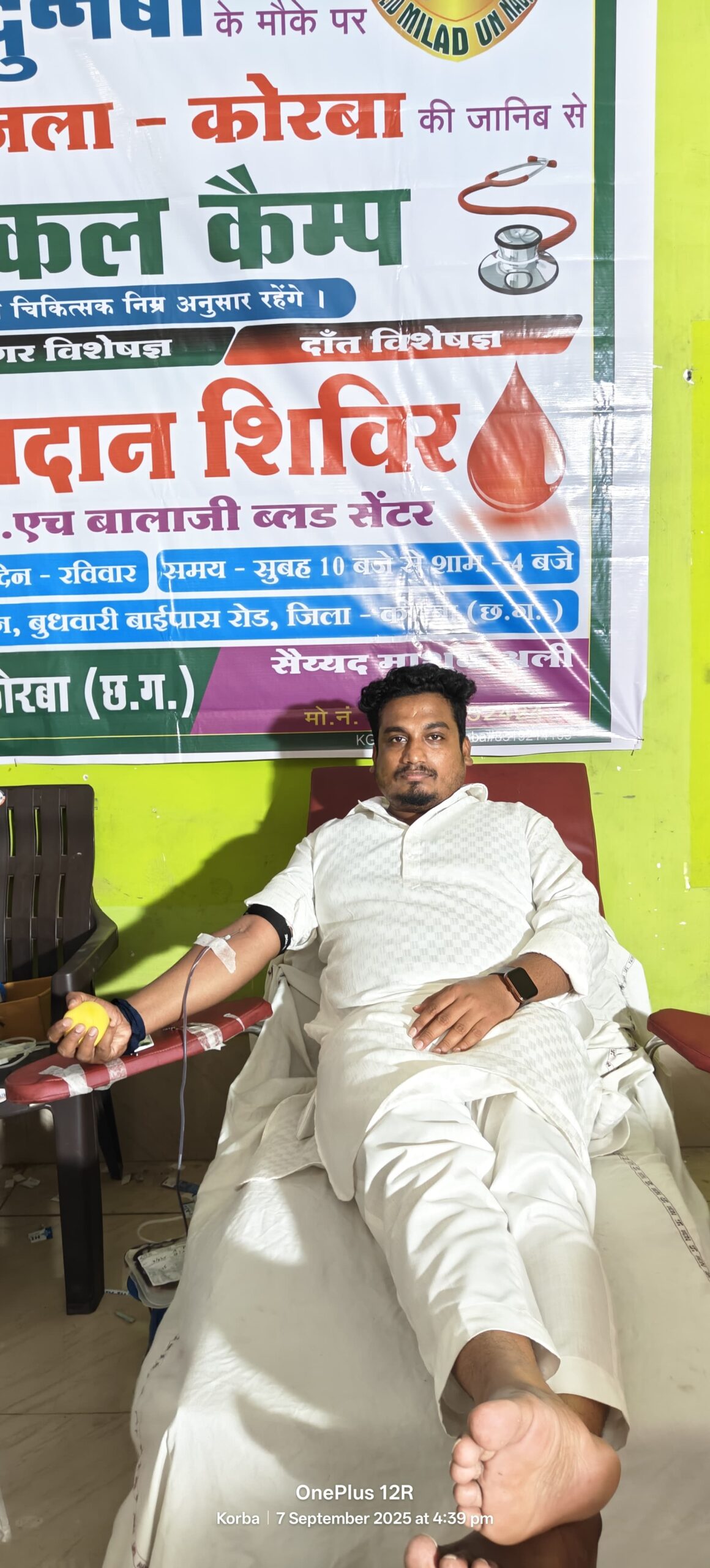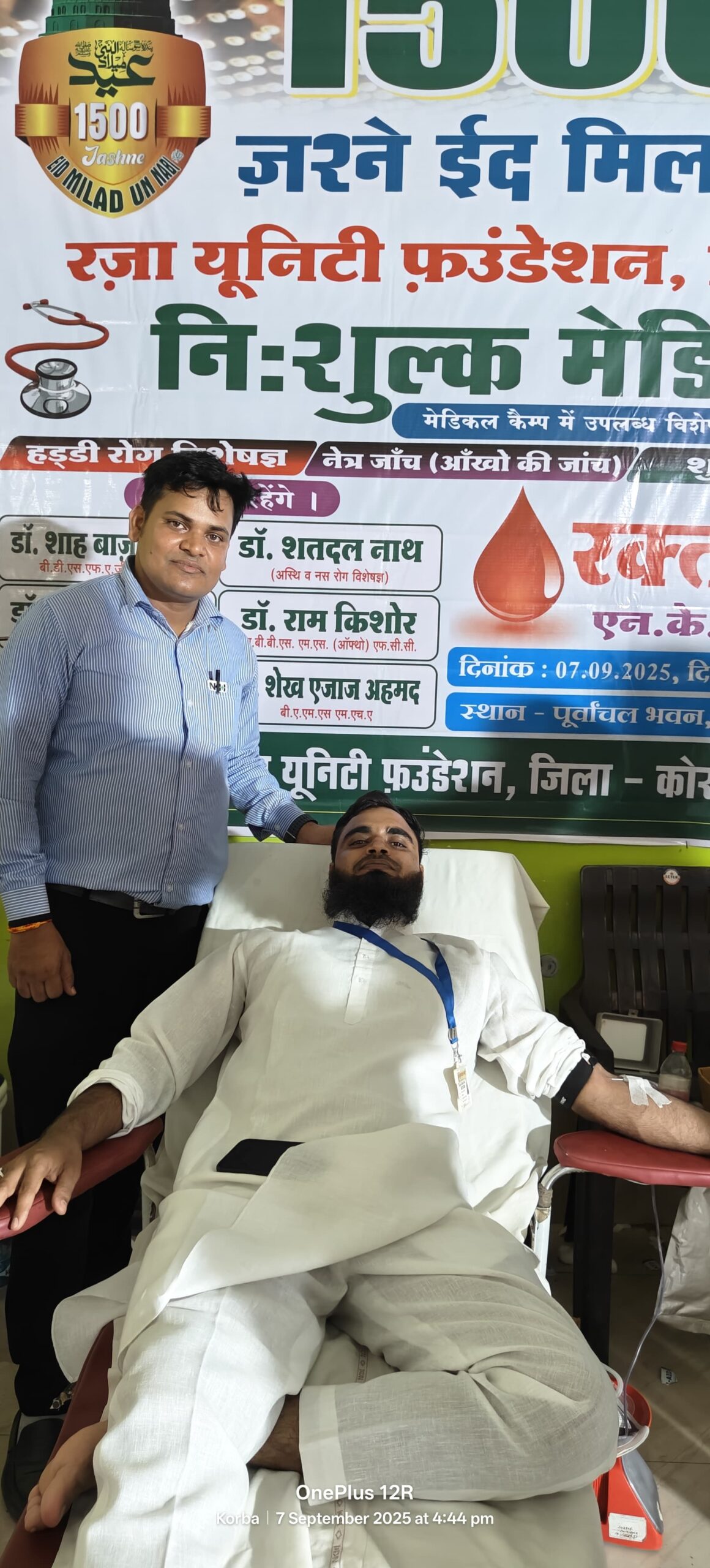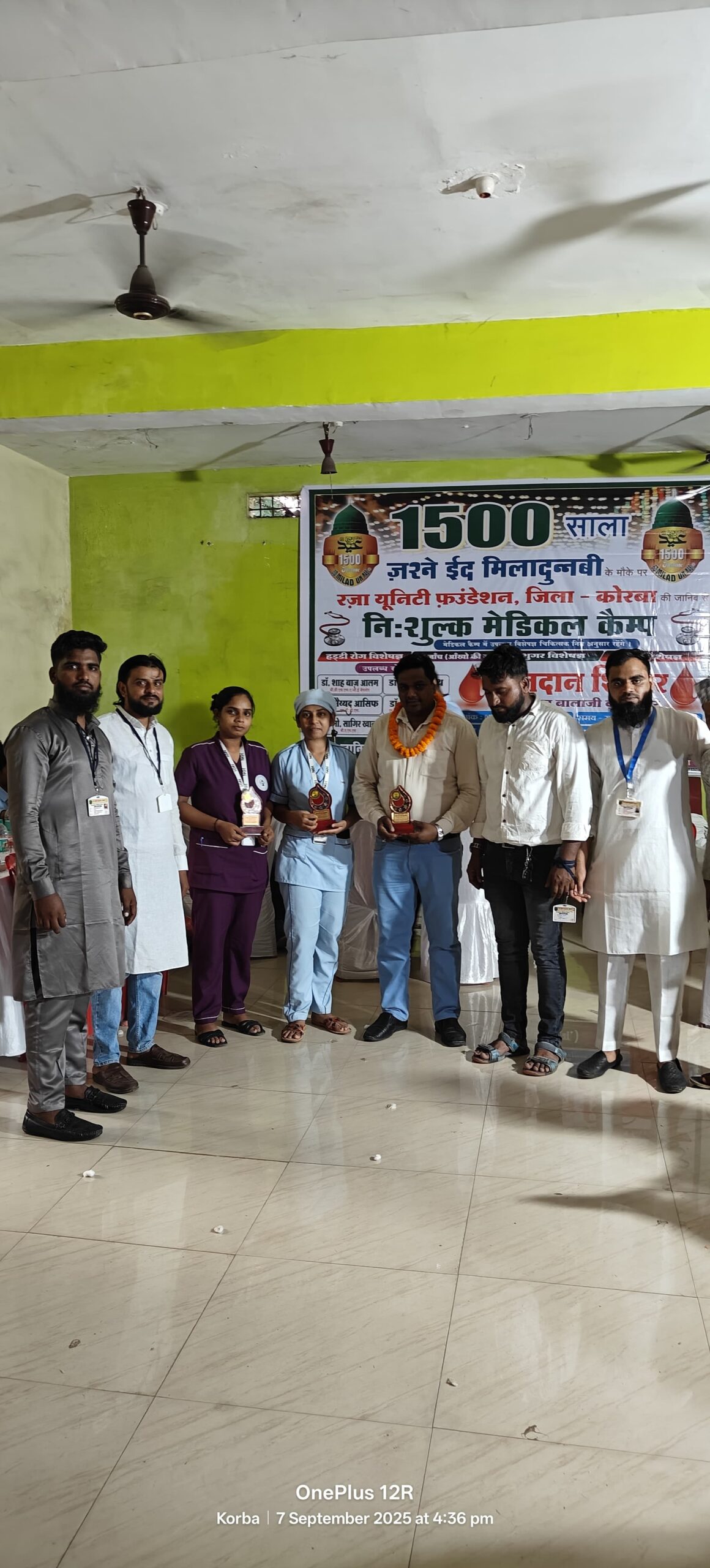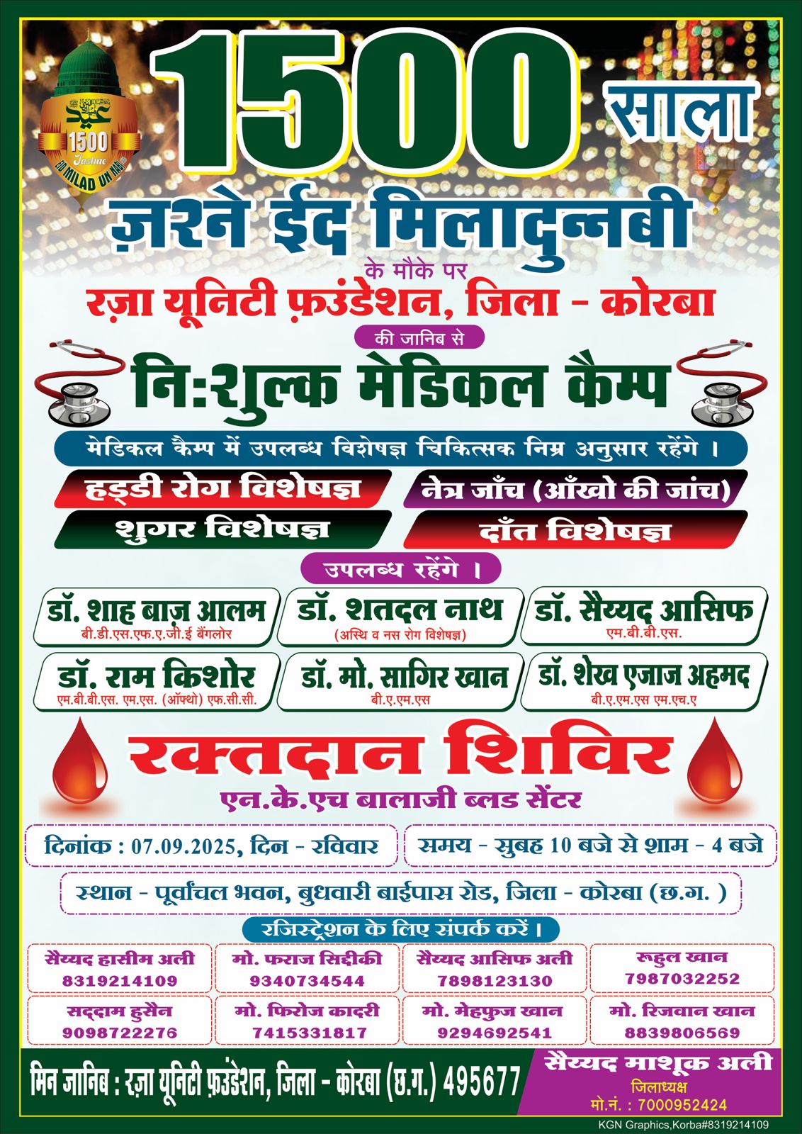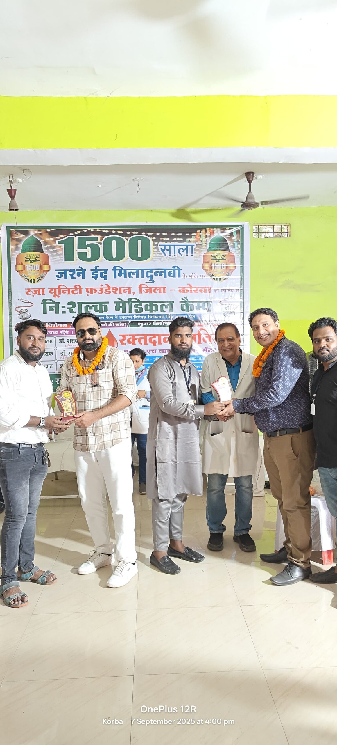 कोरबा, छत्तीसगढ़: मानवता की सेवा को सर्वोपरि मानते हुए, कोरबा के रज़ा यूनिटी फ़ाउंडेशन ने पैगंबर मुहम्मद ﷺ के जन्मदिन के अवसर पर पूर्वांचल सर्व समाज समिति कोरबा भवन में एक विशाल निशुल्क मेडिकल और रक्तदान शिविर का सफल आयोजन किया। यह आयोजन पैगंबर मुहम्मद ﷺ के 1500वें जन्मदिन की खुशी में आयोजित किया गया था।
