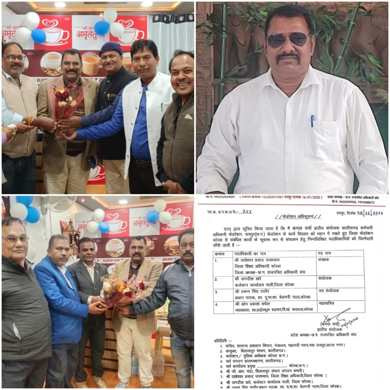 के संयोजक श्री एस. के द्विवेदी, सेवानिवृत प्रधान पाठक श्री सुरेश वस्त्रकार, छ ग शिक्षक संघ कोरबा के जिलाध्यक्ष श्री मानसिंह राठिया, छ ग प्रदेश संयुक्त शिक्षक संघ कोरबा के उपाध्यक्ष श्री अशोक कश्यप श्री एस. के. पाठक, नकुल सिंह राजवाड़े, विनय सोनवानी जिलाध्यक्ष छ ग प्रदेश तृतीय वर्ग शास. कर्मचारी संघ कोरबा, कुमुद डहरिया,टी आर कुर्रे एवं जिले के पदाधिकारियों द्वारा नव नियुक्त पदाधिकारियों को बुके भेटकर बधाई एवं शुभकामनायें प्रदान की गई। प्रांतीय संयोजक श्री कमल वर्मा जी ने नियुक्त सभी पदाधिकारियों को बधाई देते हुए आशा व्यक्त की कि उनके नेतृत्व एवं मार्गदर्शन में फेडरेशन कर्मचारी-अधिकारी हितों की रक्षा, लंबित मांगों के निराकरण तथा संगठन के विस्तार हेतु और अधिक मजबूती के साथ कार्य करेगा। नव-नियुक्त पदाधिकारियों ने भी संगठन के प्रति आभार व्यक्त करते हुए कहा कि वे पूर्ण निष्ठा, ईमानदारी एवं समर्पण भाव से कर्मचारियों के अधिकारों के लिए संघर्ष जारी रखेंगे।