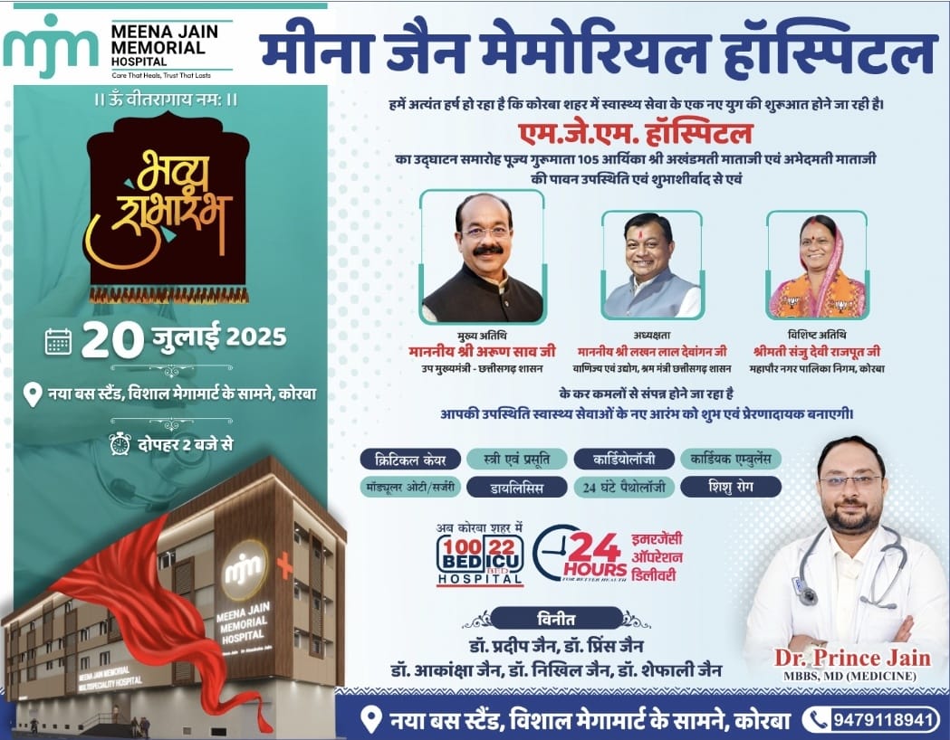 *कोरबा।* शहर के लोगों के लिए एक ऐतिहासिक दिन आने वाला है। वर्षों से इंतजार था एक ऐसे अस्पताल का जो इलाज में गुणवत्ता भी दे और खर्च में राहत भी। अब यह इंतजार खत्म हो रहा है, क्योंकि मीना जैन मेमोरियल हॉस्पिटल (MJM) का शुभारंभ कोरबा में हो रहा है — एक ऐसा मल्टी-स्पेशियलिटी हॉस्पिटल, जो न सिर्फ अत्याधुनिक सुविधाओं से लैस है, बल्कि कोरबा का सबसे भरोसेमंद और किफायती अस्पताल भी साबित होने जा रहा है।