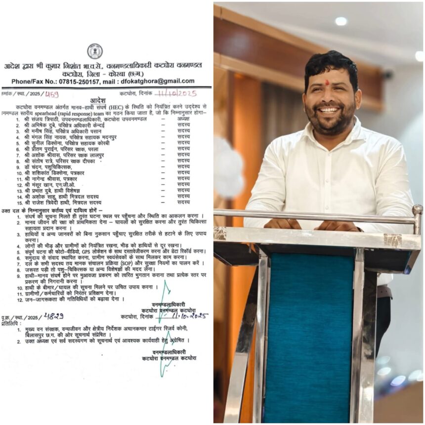 *कटघोरा में ‘हाथी-मानव संघर्ष नियंत्रण टीम’ गठित, पत्रकार शशिकांत डिक्सेना (निक्की) और हाथी विशेषज्ञ प्रभात दुबे को मिली अहम जिम्मेदारी*
