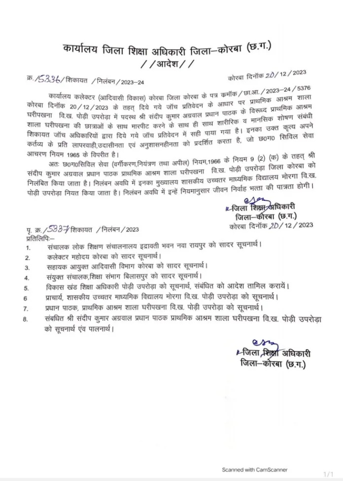 हेडमास्टर ने आश्रम की छात्राओं के साथ किया छेड़छाड़,विरोध करने पर हेडमास्टर ने पीटा,जांच के बाद DEO ने किया सस्पेंड