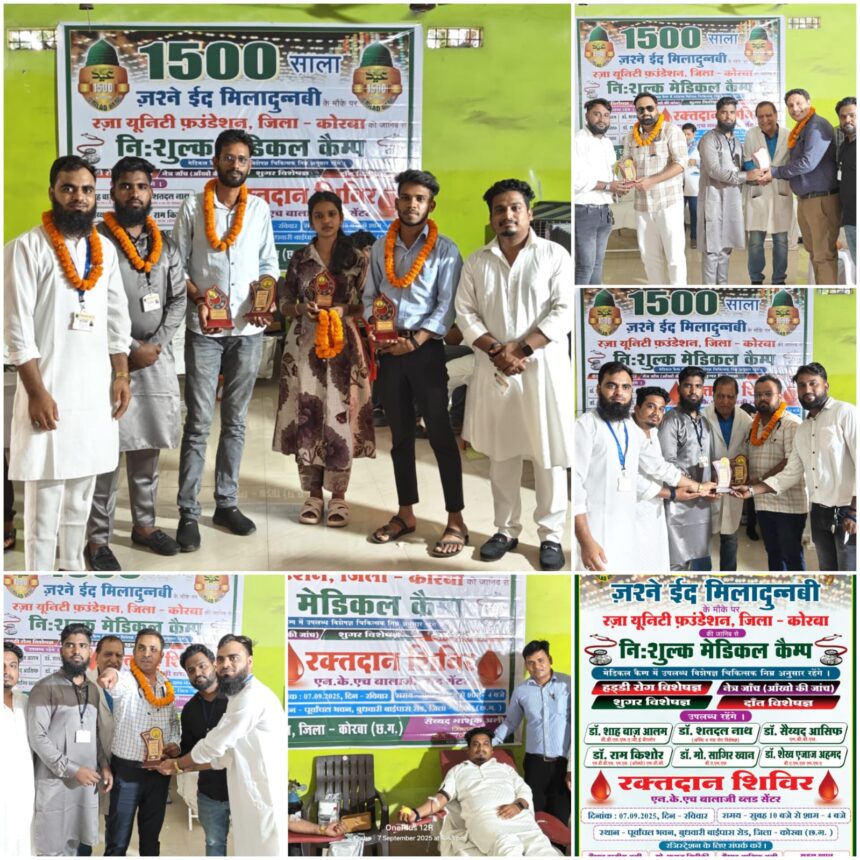 *कोरबा में रज़ा यूनिटी फ़ाउंडेशन ने पैगंबर मोहम्मद ﷺ के जन्मदिन पर आयोजित किया विशाल निशुल्क मेडिकल कैंप और रक्तदान शिविर*