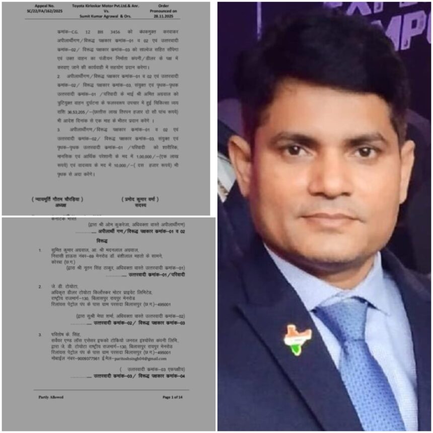 छत्तीसगढ़ राज्य उपभोक्ता आयोग ने एक महत्वपूर्ण फैसले में सीतामढ़ी कोरबा निवासी सुमित अग्रवाल को कुल 61 लाख 36 हजार रुपए देने का आदेश टोयटा कंपनी को दिया है क्योंकि…