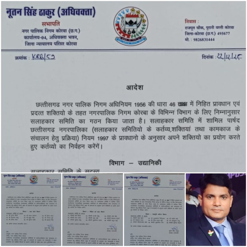 कोरबा/नगर पालिका निगम कोरबा के सभापति व अध्यक्ष नूतन सिंह ठाकुर ने छत्तीसगढ़ नगर निगम अधिनियम के तहत विभिन्न सलाहकार समितियां का गठन किया है। निगम सभापति नूतन सिंह ठाकुर…