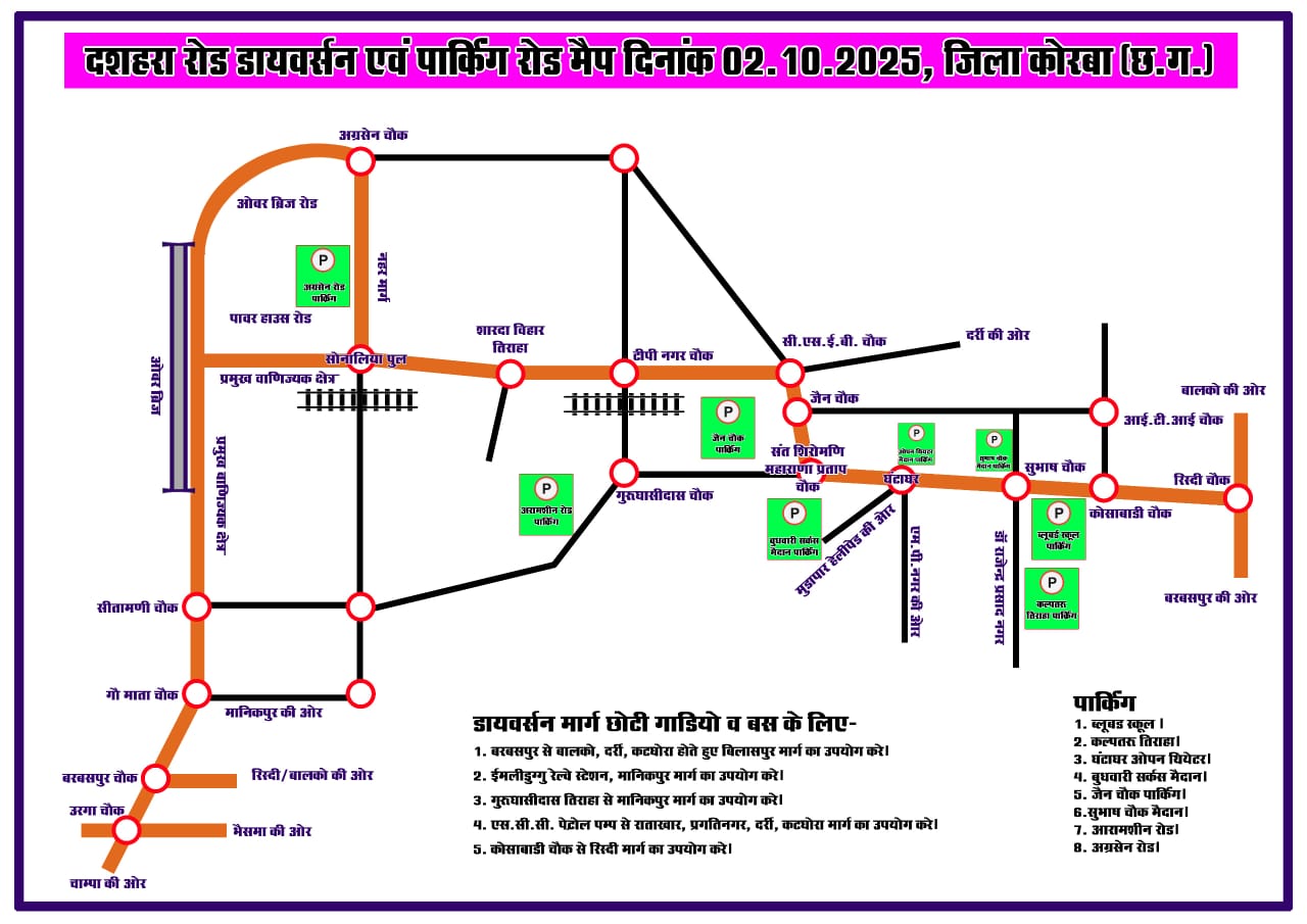 कोरबा (छत्तीसगढ़)। विजयादशमी पर्व को देखते हुए कोरबा पुलिस ने 02 अक्टूबर 2025 को सुगम यातायात व्यवस्था बनाए रखने के लिए नया रोड डायवर्सन एवं पार्किंग रोड मैप जारी कर दिया है। यह व्यवस्था खासकर झांकी देखने आने वाले लोगों की भीड़ और वाहनों की अधिकता को ध्यान में रखते हुए लागू की गई है।