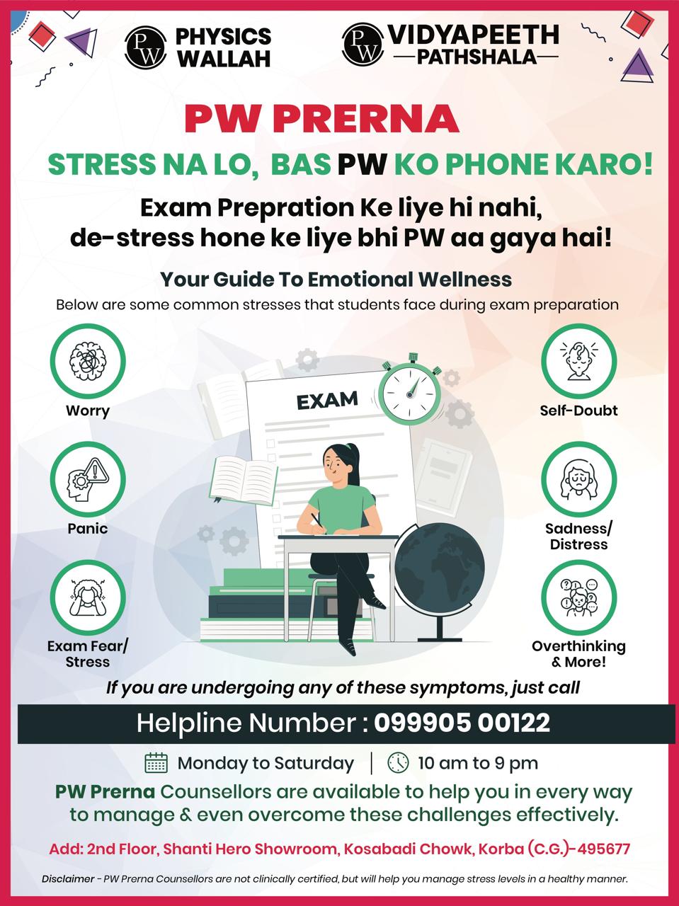 कोरबा। प्रतिस्पर्धा की अंधी दौड़, लगातार बढ़ती अपेक्षाएं और परीक्षा में बेहतर प्रदर्शन का दबाव आज के विद्यार्थियों के लिए सबसे बड़ी चुनौती बनता जा रहा है। हालिया घटनाओं ने यह साबित कर दिया है कि अंक और रैंक की होड़ में कई छात्र मानसिक रूप से टूटने की कगार तक पहुंच रहे हैं, लेकिन ऐसे संवेदनशील दौर में फिजिक्स वल्लाह विद्यापीठ पाठशाला, कोरबा ने एक जिम्मेदार और सराहनीय पहल करते हुए “PW प्रेरणा – Your Guide to Emotional Wellness” हेल्पलाइन शुरू कर विद्यार्थियों को भावनात्मक सहारा देने का ठोस प्रयास किया है। यह पहल केवल एक औपचारिक सुविधा नहीं, बल्कि उन विद्यार्थियों के लिए जीवनरेखा साबित हो सकती है, जो परीक्षा के दबाव, असफलता के डर, आत्म-संदेह और मानसिक उलझनों से जूझते हुए खुद को अकेला महसूस कर रहे हैं।