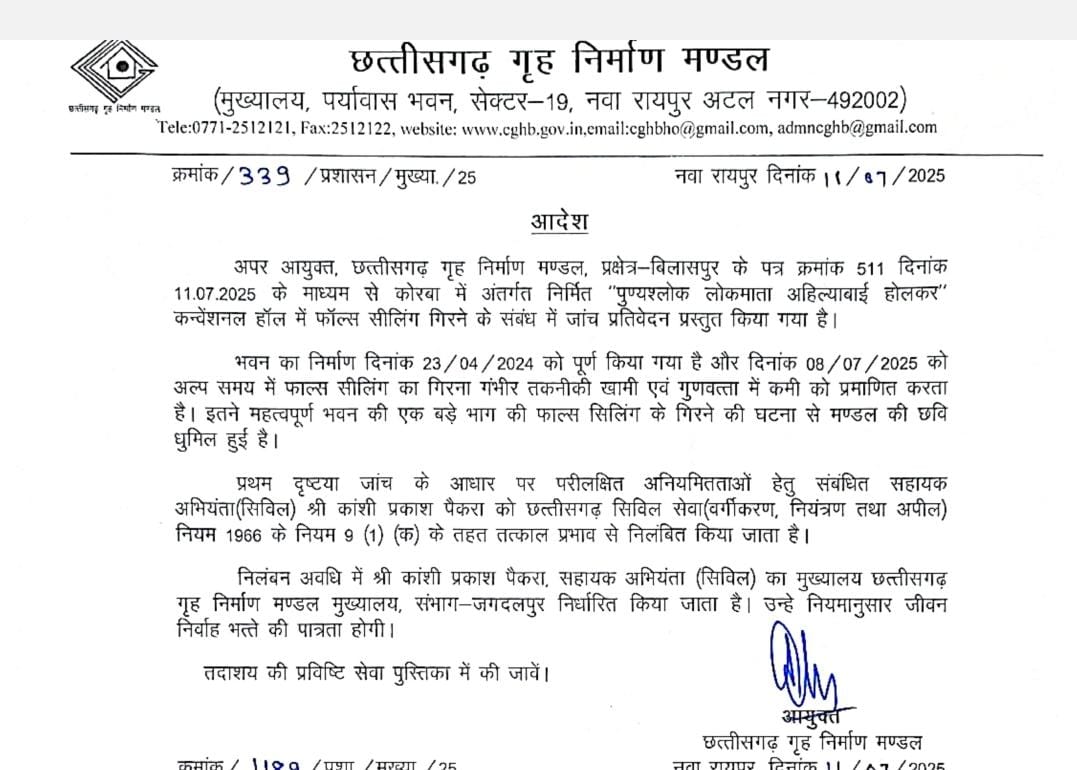 कोरबा, छत्तीसगढ़: कोरबा-रिसदी मार्ग पर 17 करोड़ रुपये की लागत से बने रानी अहिल्याबाई होलकर कन्वेंशन हॉल का छज्जा (फॉल सीलिंग) लोकार्पण के मात्र एक महीने बाद ही गिर गया। यह घटना 10 जुलाई 2025 गुरुवार की देर रात हुई, जब हॉल पूरी तरह से खाली था। इस हादसे के बाद निर्माण गुणवत्ता और कार्यप्रणाली पर गंभीर सवाल उठ खड़े हुए हैं।