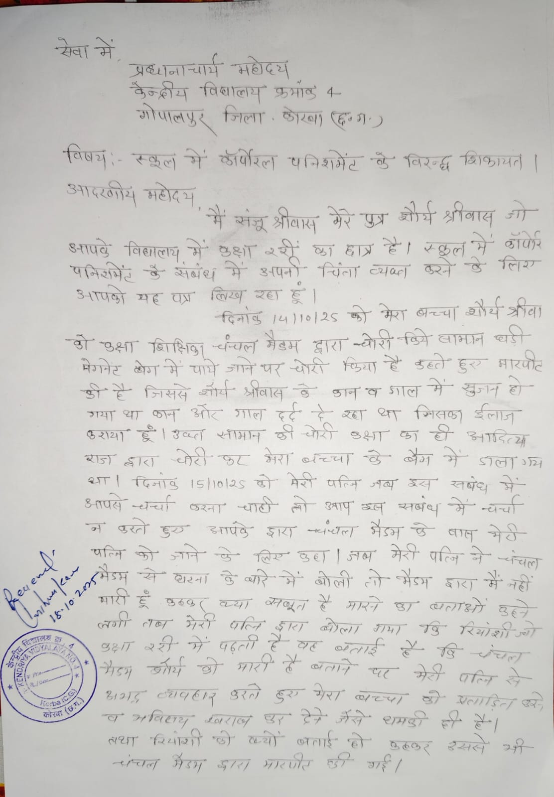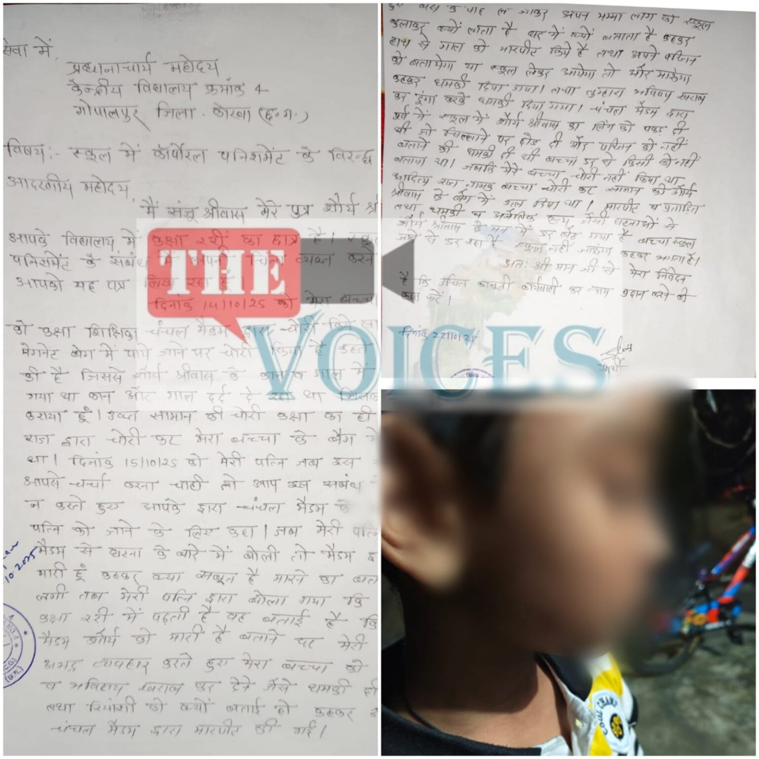 कोरबा: शिक्षा के मंदिर कहे जाने वाले केंद्रीय विद्यालय क्रमांक 4 गोपालपुर से एक अत्यंत शर्मनाक और सनसनीखेज मामला सामने आया है। यहां दूसरी कक्षा में पढ़ने वाले एक मासूम छात्र शौर्य श्रीवास के साथ उसी की शिक्षिका चंचल मैडम पर गंभीर अत्याचार करने के आरोप लगे हैं। परिजनों ने शिक्षिका पर मासूम के साथ मारपीट करने, जान से मारने की धमकी देने और अनैतिक हरकत करने का गंभीर आरोप लगाया है।