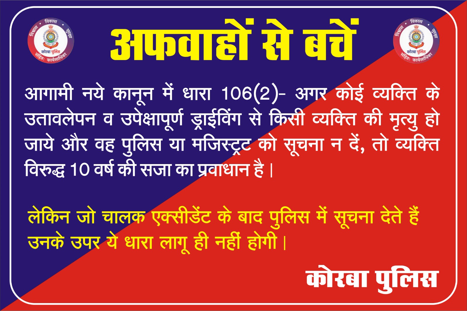 आगामी नये कानून में धारा 106(2) – अगर कोई व्यक्ति के उतावलेपन व उपेक्षापूर्ण कार्य से किसी व्यक्ति की मृत्यु हो जाये। और वह पुलिस या मजिस्ट्रेट को सूचना न दें, तो 10 वर्ष की सजा का प्रावधान है।